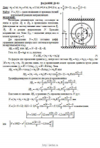 При движении грузов угол φ1 = ∠A2C3D1изменяется по закону φ1 = f1(t), а угол φ2 = ∠A2C3D2 — по закону φ2 = f2(t). В табл. ДЗ эти зависимости даны отдельно для рис. 0—4 и 5—9, где φ выражено в радианах, t — в секундах. Считая грузы материальными точками и пренебрегая всеми сопротивлениями, определить закон изменения со временем величины, указанной в таблице в столбце «Найти», т. е. x3 = t3(t) и N = f(t), где x3 — координата центра C3 плиты (зависимость x3 = f3(t) определяет закон движения плиты), N — полная нормальная реакция направляющих.