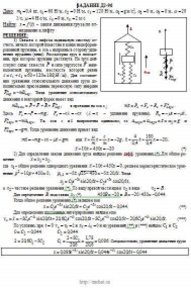 Груз 1 массой m укреплен на пружинной подвеске в лифте (рис. Д2.0 — Д2.9, табл. Д2). Лифт движется вертикально по закону z = 0,5α1t2 + α2sin(ωt) + α3cos(ωt) (ось z направлена по вертикали вверх; z выражено в метрах, t — в секундах). На груз действует сила сопротивления среды R = μv, где v — скорость груза по отношению к лифту. Найти закон движения груза по отношению к лифту, т. е. х = f(t); начало координат поместить в точке, где находится прикрепленный к грузу конец пружины, когда пружина не деформирована. При этом во избежание ошибок в знаках направить ось х в сторону удлинения пружины, а груз изобразить в положении, при котором х>0, т.е. пружина растянута. При подсчетах можно принять g = 10 м/с2. Массой пружин и соединительной планки 2 пренебречь. В таблице обозначено: c1, с2, c3 — коэффициенты жесткости пружин, λ0 — удлинение пружины с эквивалентной жесткостью в начальный момент времени t = 0, v0 — начальная скорость груза по отношению к лифту (направлена вертикально вверх). Прочерк в столбцах c1, с2, c3 означает, что соответствующая пружина отсутствует и на чертеже изображаться не должна. Если при этом конец одной из оставшихся пружин окажется свободным, его следует прикрепить в соответствующем месте или к грузу или к потолку (полу) лифта; то же следует сделать, если свободными окажутся соединенные планкой 2 концы обеих оставшихся пружин. Условие μ = 0 означает, что сила сопротивления R отсутствует.