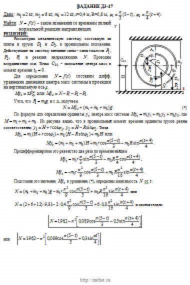 При движении грузов угол φ1 = ∠A2C3D1изменяется по закону φ1 = f1(t), а угол φ2 = ∠A2C3D2 — по закону φ2 = f2(t). В табл. ДЗ эти зависимости даны отдельно для рис. 0—4 и 5—9, где φ выражено в радианах, t — в секундах. Считая грузы материальными точками и пренебрегая всеми сопротивлениями, определить закон изменения со временем величины, указанной в таблице в столбце «Найти», т. е. x3 = t3(t) и N = f(t), где x3 — координата центра C3 плиты (зависимость x3 = f3(t) определяет закон движения плиты), N — полная нормальная реакция направляющих.