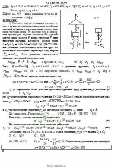 Груз 1 массой m укреплен на пружинной подвеске в лифте (рис. Д2.0 — Д2.9, табл. Д2). Лифт движется вертикально по закону z = 0,5α1t2 + α2sin(ωt) + α3cos(ωt) (ось z направлена по вертикали вверх; z выражено в метрах, t — в секундах). На груз действует сила сопротивления среды R = μv, где v — скорость груза по отношению к лифту. Найти закон движения груза по отношению к лифту, т. е. х = f(t); начало координат поместить в точке, где находится прикрепленный к грузу конец пружины, когда пружина не деформирована. При этом во избежание ошибок в знаках направить ось х в сторону удлинения пружины, а груз изобразить в положении, при котором х>0, т.е. пружина растянута. При подсчетах можно принять g = 10 м/с2. Массой пружин и соединительной планки 2 пренебречь. В таблице обозначено: c1, с2, c3 — коэффициенты жесткости пружин, λ0 — удлинение пружины с эквивалентной жесткостью в начальный момент времени t = 0, v0 — начальная скорость груза по отношению к лифту (направлена вертикально вверх). Прочерк в столбцах c1, с2, c3 означает, что соответствующая пружина отсутствует и на чертеже изображаться не должна. Если при этом конец одной из оставшихся пружин окажется свободным, его следует прикрепить в соответствующем месте или к грузу или к потолку (полу) лифта; то же следует сделать, если свободными окажутся соединенные планкой 2 концы обеих оставшихся пружин. Условие μ = 0 означает, что сила сопротивления R отсутствует.
